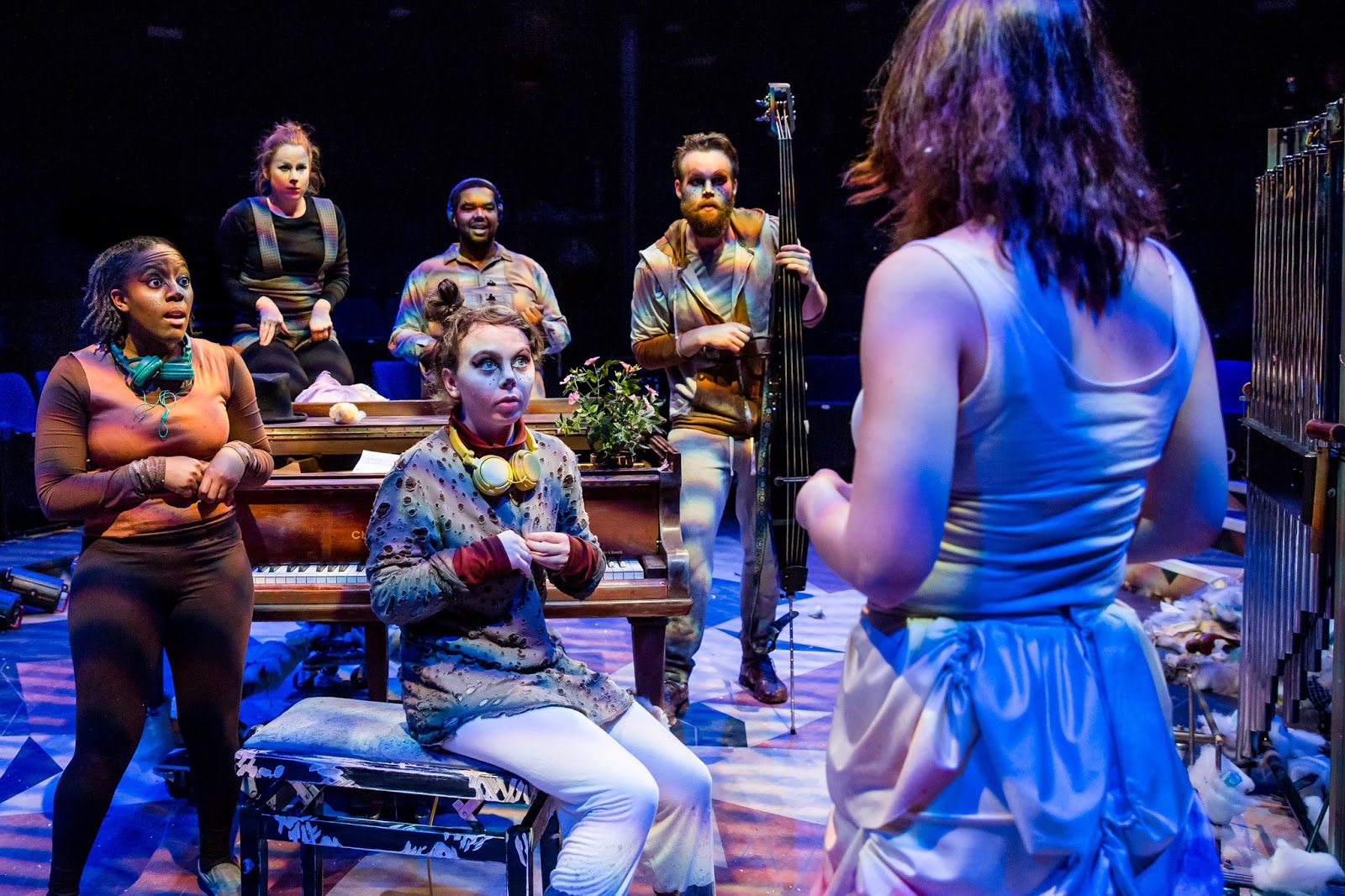 The play has a tiny company, of just six actors, with the five rats taking on the additional roles including ugly sisters, stepmother and prince, and just a change of headgear making the switch. In addition to telling the story through their dialogue, the rats play grand piano, double bass and percussion instruments on stage, while singing too! The tubular bells especially provide a really festive note, there's something about hearing them struck that instantly transports me to Christmas. It's a hugely energetic production with few of the cast leaving the stage for too long and props and costume changes being hidden in the corners of Cinders' kitchen .
